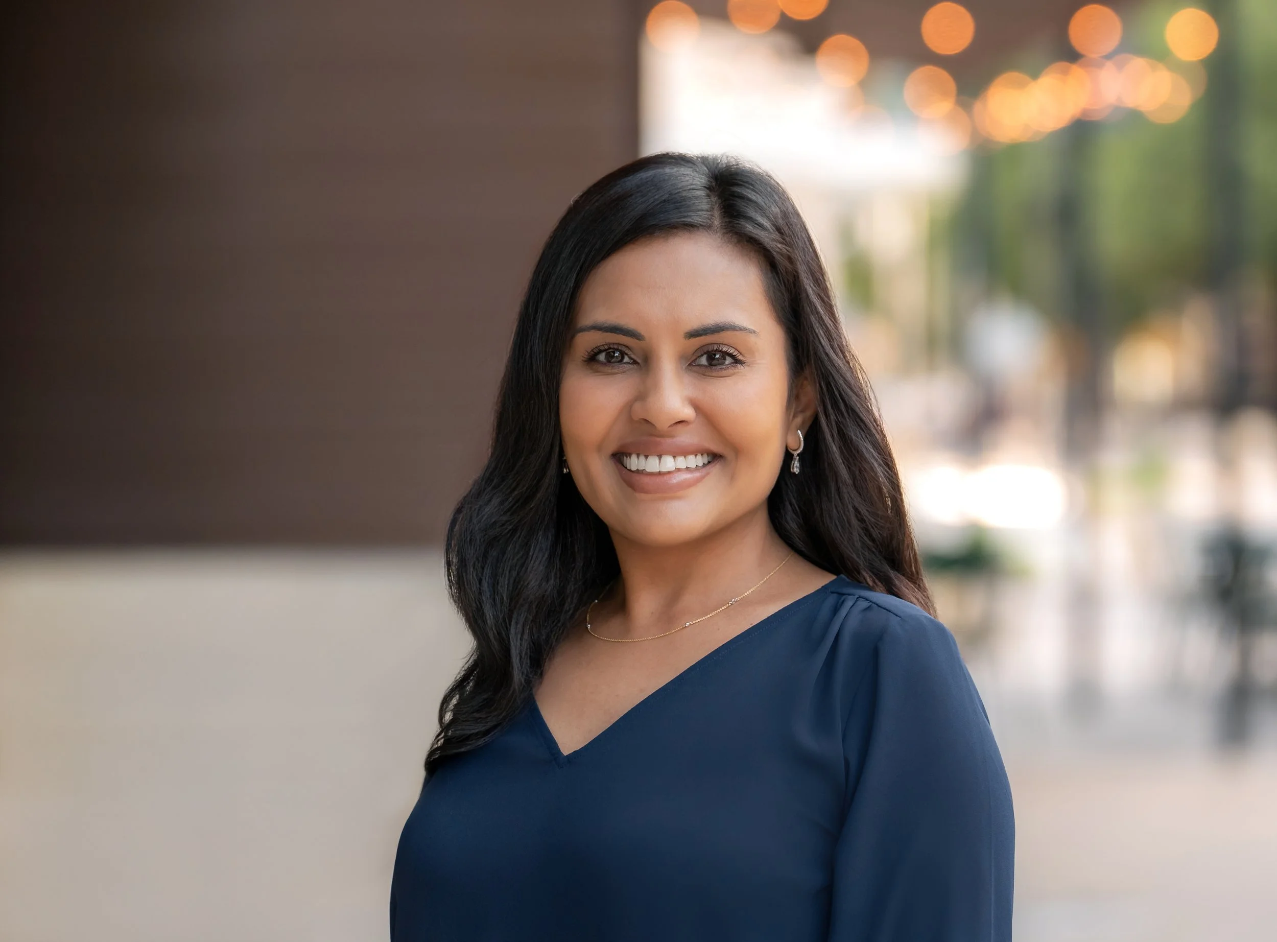 • Licensed Marriage and Family Therapist, Sonali Chokshi, smiling with long dark hair wearing a navy blue top standing outside her therapy office in Frisco, Texas with blurred background trees and warm lighting.